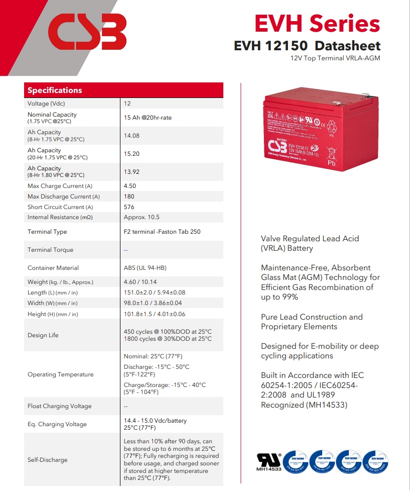 EVH代表电动车辆(Electric Vehicle H) ,在EVX产品的基础上特别针对循环寿命及放电时间进行改良,主要特点如下: ü EVH系列特别适合用于电动车辆及手持式工具 ü 当电池安全环境下使用时,则无须维护及补充水分,并且可以反覆充放电 ü 因为完全密闭,所以可以垂直、水平或侧向放置,且不影响安全性及功能性 ü 以自动化制程搭配独特之铅钙合金配方,有效减少气体排放 ü 长寿命、低自放电及高可靠度 ü 其安全及低内阻带来了良好地充放电性能改善 ü 电池外壳可采用符合UL 94V-0之耐燃ABS材料 ü 循环使用 ü 高率放电设计 ü 深放电恢复 ü 电池皆透过专利电脑化充放电系统严格测试 ü 通过ISO9001, 14001, OHSMS 18001 认证 ü 通过UL 1989认证 (档案编号 MH14533) ü 航空运输符合IATA/ICAO A67条款 ü 水路运输符合非危险物品MG27修正类别 ü 公路运输符合【Dry charge】 49CFR 171-189许可