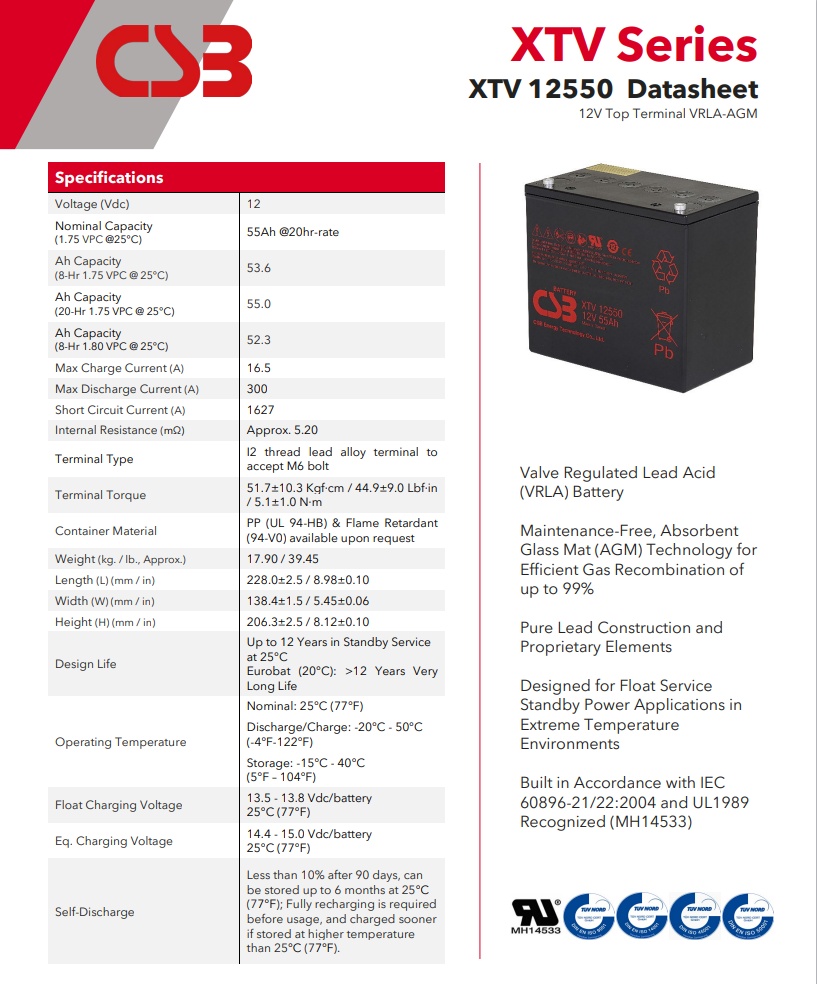 XTV来自于英文 extreme temperatures version之缩写,代表着极端温度版本。此系列特别适用于在严苛温度条件下仍需要充足电池性能之应用,主要特点如下: 1 当电池安全环境下使用时,则无须维护及补充水分,并且可以反覆充放电 2 因为完全密闭,所以可以垂直、水平或侧向放置,且不影响安全性及功能性 3 以自动化制程搭配独特之铅钙合金配方,有效减少气体排放 4 长寿命、低自放电及高可靠度 5 其安全及低内阻带来了良好地充放电性能改善 6 电池外壳依型号可采用符合UL 94V-0之耐燃ABS或PP材料 7 适合待机使用 8 高率放电设计 9 深放电恢复 10 电池皆透过专利电脑化充放电系统严格测试 11 通过ISO9001, 14001, OHSMS 18001 认证 12 通过UL 1989认证 (档案编号 MH14533) 13 航空运输符合IATA/ICAO A67条款 14 水路运输符合非危险物品MG27修正类别 15 公路运输符合【Dry charge】 49CFR 171-189许可 16 创新之极板结构有效提升于严苛环境下的使用寿命 17 达成不影响性能仍可降低热逸走风险之崭新铅膏配方 浮充使用: 不断电系统 工作站不断电系统 紧急照明设备 精密仪器备载电源 火灾警报及保全系统 通信及电子设备 办公室电脑, 处理器及其他办公室自动化设备 机器人, 自动控制设备及其他工厂自动化设备 发电厂及变电站之紧急电源供应 电信基地台 各式遥测设备 太阳能: 路灯 移动式电源供应器 抽水站 区域性电力系统 |