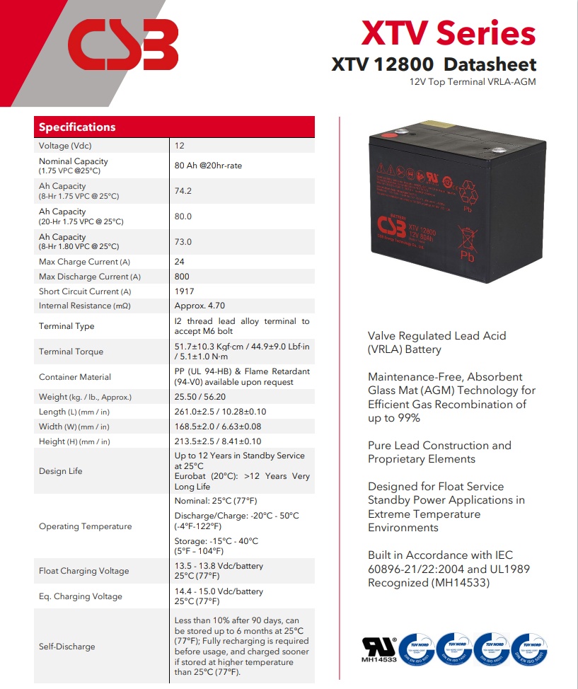 XTV来自于英文 extreme temperatures version之缩写,代表着极端温度版本。此系列特别适用于在严苛温度条件下仍需要充足电池性能之应用,主要特点如下: 1 当电池安全环境下使用时,则无须维护及补充水分,并且可以反覆充放电 2 因为完全密闭,所以可以垂直、水平或侧向放置,且不影响安全性及功能性 3 以自动化制程搭配独特之铅钙合金配方,有效减少气体排放 4 长寿命、低自放电及高可靠度 5 其安全及低内阻带来了良好地充放电性能改善 6 电池外壳依型号可采用符合UL 94V-0之耐燃ABS或PP材料 7 适合待机使用 8 高率放电设计 9 深放电恢复 10 电池皆透过专利电脑化充放电系统严格测试 11 通过ISO9001, 14001, OHSMS 18001 认证 12 通过UL 1989认证 (档案编号 MH14533) 13 航空运输符合IATA/ICAO A67条款 14 水路运输符合非危险物品MG27修正类别 15 公路运输符合【Dry charge】 49CFR 171-189许可 16 创新之极板结构有效提升于严苛环境下的使用寿命 17 达成不影响性能仍可降低热逸走风险之崭新铅膏配方 浮充使用: 不断电系统 工作站不断电系统 紧急照明设备 精密仪器备载电源 火灾警报及保全系统 通信及电子设备 办公室电脑, 处理器及其他办公室自动化设备 机器人, 自动控制设备及其他工厂自动化设备 发电厂及变电站之紧急电源供应 电信基地台 各式遥测设备 太阳能: 路灯 移动式电源供应器 抽水站 区域性电力系统 |